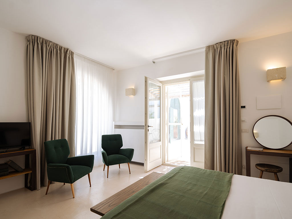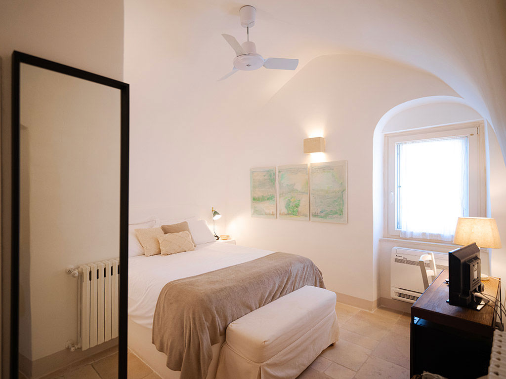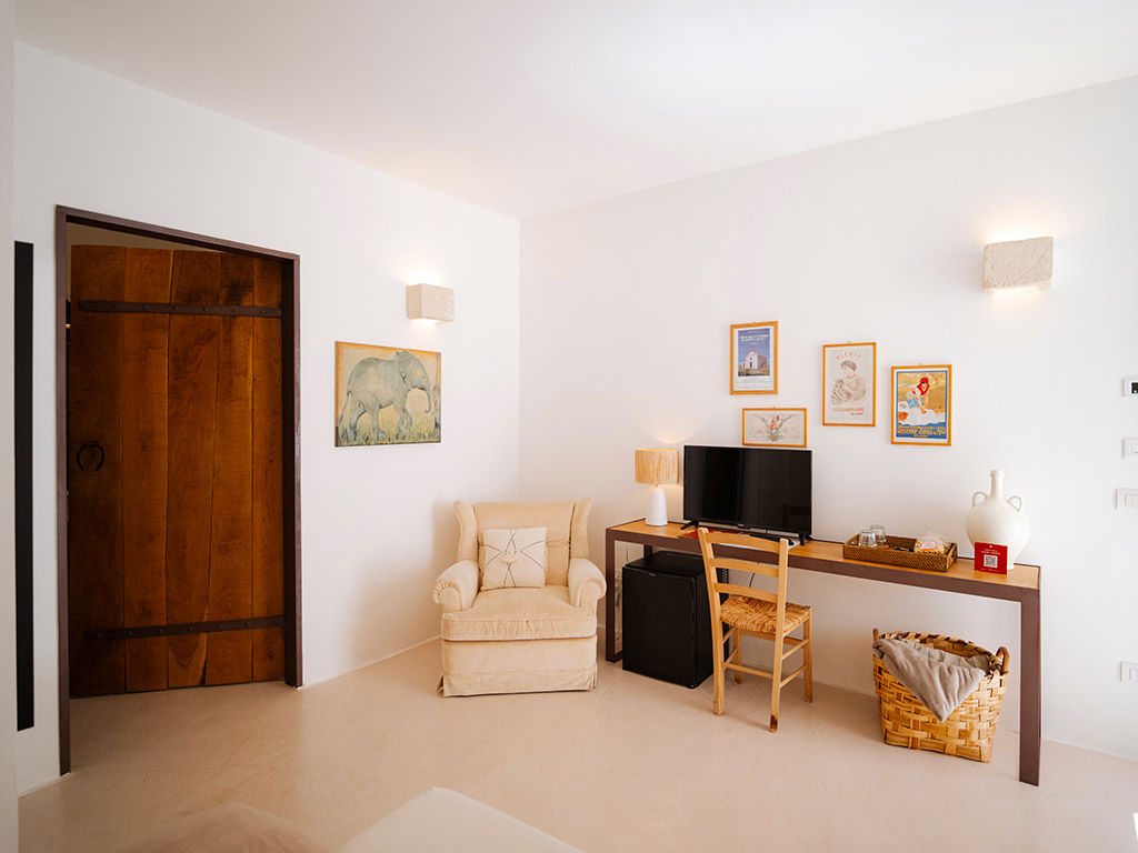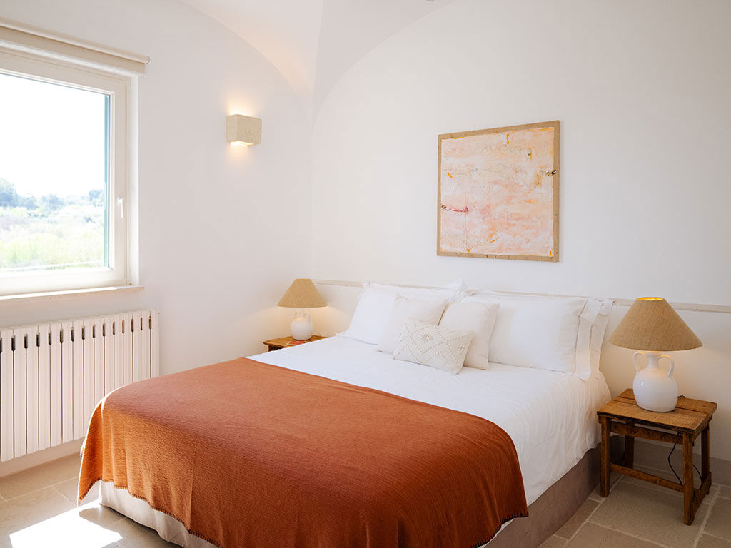 Timo e Lavanda, con i loro 28 m² di eleganza e tranquillità, sono il rifugio perfetto per chi cerca comfort e silenzio. Il letto King-size assicura un riposo rigenerante, mentre la possibilità di aggiungere un terzo letto le rende ideali anche per piccoli gruppi o famiglie. Il patio privato, arredato con un tavolino e due sedie, è un angolo esclusivo dove rilassarsi immersi nella quiete della masseria, lasciandosi avvolgere dai profumi e dai colori della Valle d’Itria.